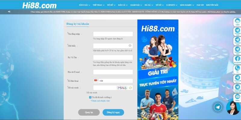 Với những ai đang đam mê cá cược thì việc không biết cách đăng ký với Hi88 có lẽ là một sai lầm lớn. Vì việc tạo tài khoản cực kỳ dễ dàng nên chỉ cần chú ý một chút là bạn sẽ có ngay một tài khoản hợp lệ. Không để người chơi phải chờ đợi quá lâu, cổng game sẽ hướng dẫn chi tiết như sau.